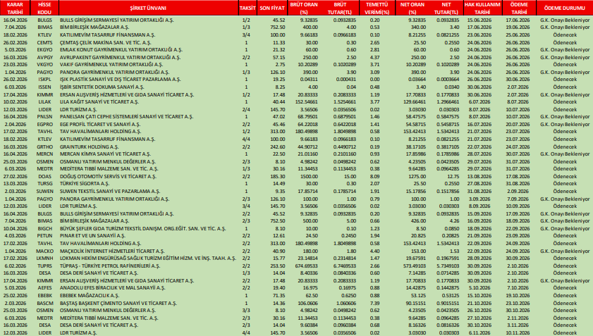 Alnus Yatırım, yatırımcılar için 2026 yılı temettü takvimi raporunu yayımladı. Raporda şirketlerin temettü ödeme tarihleri ve beklentileri detaylı olarak yer aldı. Veriler şöyle: